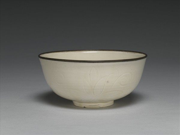此碗敞口,弧形深壁,小圈足,口緣鑲有銅釦。全器施以白釉,外壁有流釉現象,色近米黃。碗以轆轤拉坏成形,外壁留有輪製痕跡,內壁修整得細緻光滑。外壁以劃花手法勾勒兩朵蓮花和周圍的捲葉,從線條形式來看,先從刀尖端入土,透過有力的提頓,其次側邊輕劃,弧度彎曲處則拉出較寬的陰影,最後再以有力的提頓收刀,就如繪畫之筆法,有許多輕重轉折的變化。在花瓣和葉面邊緣有重複的劃線,則作花葉之陰影裝飾。