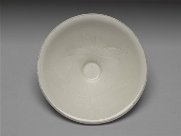 此碗尺寸較小,口沿外撇,壁面斜削,小圈足。口緣一圈無釉,似原鑲有銅釦,而今剝落。全器施以白釉,外壁有流釉現象,色近米黃。周壁有劃花而成的蓮花和捲葉。從線條形式來看,先從刀尖端入土,透過有力的提頓,其次側邊輕劃,弧度彎曲處則拉出較寬的陰影,最後再以有力的提頓收刀,就如繪畫之筆法,有許多輕重轉折的變化。在花瓣和葉面邊緣有重複的劃線,則作花葉之陰影裝飾。