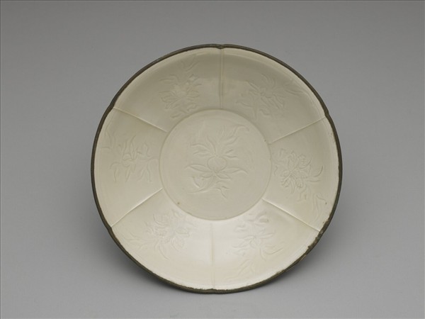 此盤口作六瓣花形,口沿微外折,弧形淺壁,底有圈足,口沿鑲有銅釦。此盤是以轆轤成形之後,再於器外壁壓劃六道垂直凹痕,呈花瓣狀。內壁除圈狀碗心之外,另壓印六道出戟成六格佈局。每格以劃花手法勾勒折枝花卉的輪廓,再以篦狀工具造成複線,藉此表現花瓣的質理。全器施以白釉,外壁有米黃色的流釉現象。