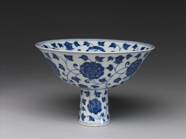 撇口,深弧壁,高足微侈,足中空。全器滿畫芙蓉花,碗內外壁各畫轉枝芙蓉六朵,碗心二朵,圈足三朵,口足間則加飾青線十道。青花鮮艷,帶褐綠鐵質結晶斑。胎骨勻薄,圈足亦同, 足圈露胎,質堅細膩。底青花書「宣德年製」二行四字楷款。