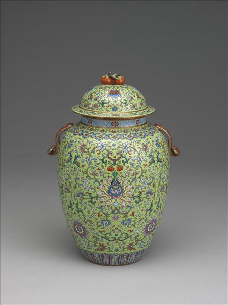 綠地粉彩番蓮紋雙耳蓋罐