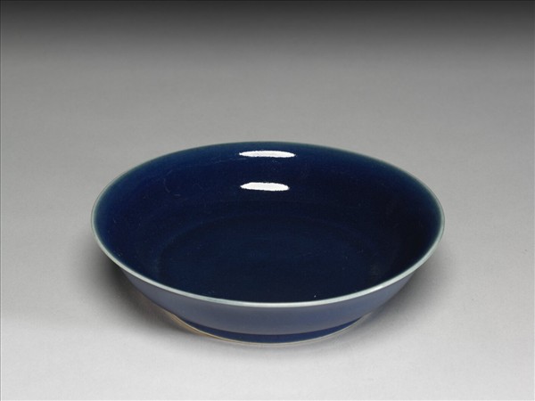 侈口窄唇,淺弧形壁,矮圈足。全器施霽青釉,施釉至足邊,口沿與足邊各留一道白邊,足沿無釉露白胎。足內壁及底施白釉,底有「大明宣德年製」六字二行楷體暗款,外加雙圈。