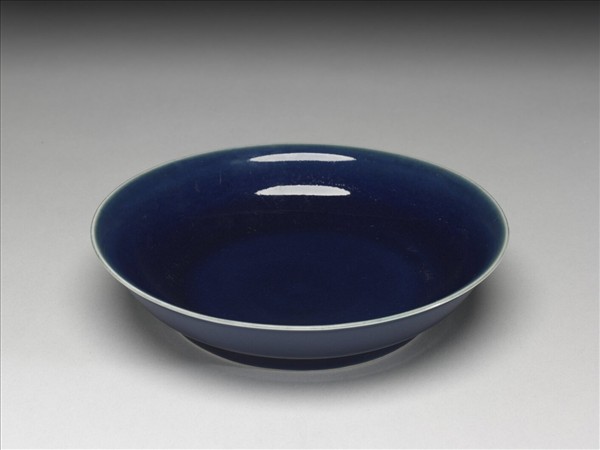 侈口窄唇,淺弧形壁,矮圈足。全器施霽青釉,施釉至足邊,口沿與足邊各留一道白邊,足沿無釉露白胎。足內壁及底施白釉,底有「大明宣德年製」六字二行楷體暗款,外加雙圈。