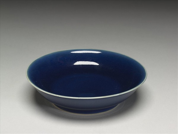 侈口窄唇,淺弧形壁,矮圈足。全器施霽青釉,施釉至足邊,口沿與足邊各留一道白邊,足沿無釉露白胎。足內壁及底施白釉,底有青花書「大明宣德年製」六字二行楷款,外加雙圈。