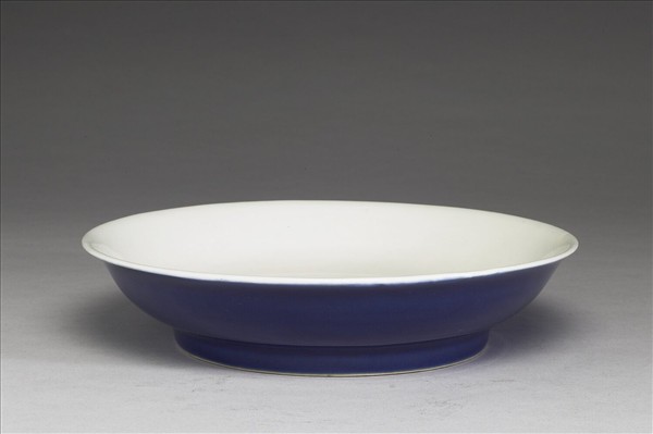 侈口,弧壁,平底,圈足。外施霽青釉,裡為白釉,內壁印飾暗龍紋一對,盤心淺劃品字雲紋。青釉濃重帶紫,口沿露「燈草邊」白邊一周、積釉泛青。圈足露胎,堅而細膩,泛橙色夾鐵斑。底劃「大明宣德年製」二行六字楷款,外加雙圈。