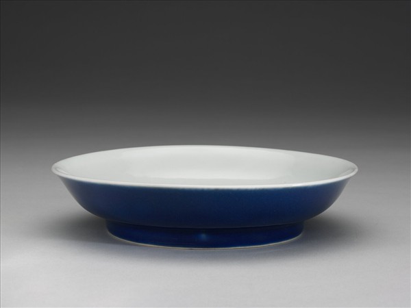 侈口,淺壁弧形,矮圈足。胎質稍厚,外壁施霽青釉,內壁錐拱雙龍紋,模糊不清。盤心及底純白,樸素無紋飾。底有「大明宣德年製」六字二行楷體暗款,外加雙圈。