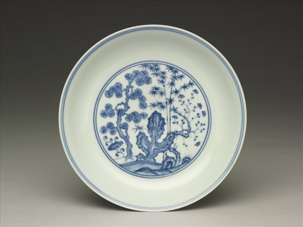 侈口窄唇,淺壁,圈足。以釉下青花繪飾。盤外壁以雲紋將松、竹、梅等歲寒三友及庭院仕女分成不同的二個畫面景觀,綴以欄杆、遠山、星斗、納涼、焚香、燭台等。內壁素白無紋,盤心畫松、竹、梅及湖石、靈芝。內外共飾青線十道。底青花書「大明成化年製」雙圈六字楷款。