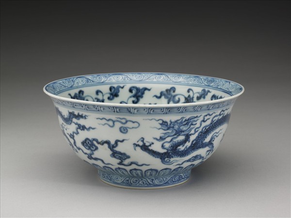 侈口,深壁,矮圈足。碗內口唇上畫卷草紋,周壁畫纏枝番蓮五朵,碗心畫茶花一枝。外口沿下畫回紋,周壁畫雙龍戲珠,底邊畫雲頭紋,足畫卷草紋。內外加飾青線十一道。底有青花書「大明宣德年製」六字二行楷款,外加雙圈。