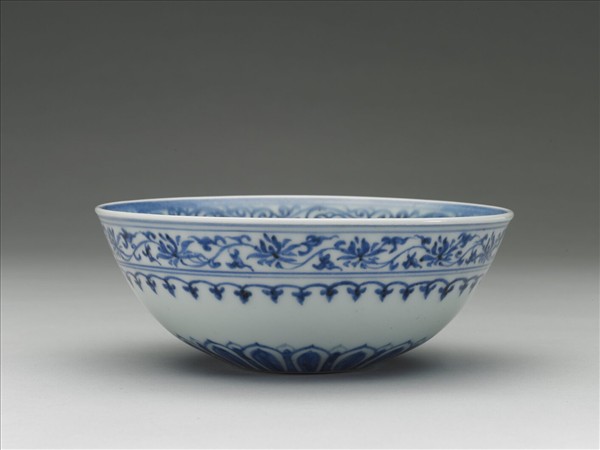 敞口,深壁,凸底,矮圈足。碗內口沿下畫卷草紋一周,碗心為八瓣圖案花一朵,應為變形蓮的一種,外加阿拉伯圖案紋二層。外口沿下飾纏枝花卉紋二層,底邊蓮瓣紋一周,中段留白。底有青花書「大明宣德年製」六字二行楷款,外加雙圈。