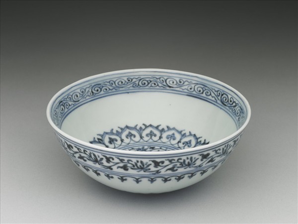 敞口,深壁,凸底,矮圈足。碗內口沿下畫卷草紋一周,碗心為八瓣圖案花一朵,應為變形蓮的一種,外加阿拉伯圖案紋二層。外口沿下飾纏枝花卉紋二層,底邊蓮瓣紋一周,中段留白。底有青花書「大明宣德年製」六字二行楷款,外加雙圈。