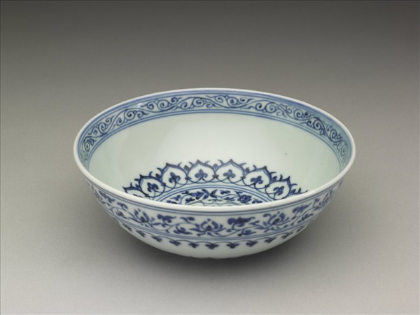 敞口,深壁,凸底,矮圈足。碗內口沿下畫卷草紋一周,碗心為八瓣圖案花一朵,應為變形蓮的一種,外加阿拉伯圖案紋二層。外口沿下飾纏枝花卉紋二層,底邊蓮瓣紋一周,中段留白。底有青花書「大明宣德年製」六字二行楷款,外加雙圈。