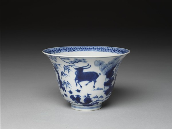 撇口,矮圈足。內口緣畫菱形紋錦一圈,間飾青線二道。碗心繪麒麟一隻,外加雙青線。外壁畫羊三隻,與天上的太陽共同組成「三羊開泰」的圖案,背景間飾松、竹、柳、湖石等。口沿至底足共畫青線五道。底有青花書「大明嘉靖年製」六字二行楷款,外加雙圈。