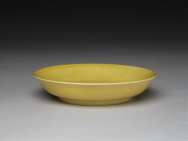 侈口,淺壁弧形,矮圈足。胎質稍厚,器內外壁滿施嬌黃釉,盤底純白,樸素無紋飾。底有青花書「大明正德年製」二行六字楷款,外加雙圈。