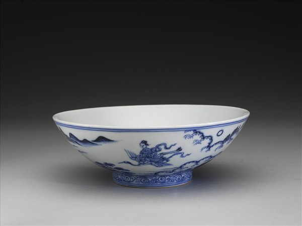 敞口,深壁,矮圈足。外壁畫仙人騎鶴、庭園及雲山之景,足圈畫卷草紋一道。口足間加飾青線六道。內面純白,樸素無紋飾。底有青花書「大明宣德年製」六字二行楷款,外加雙圈。