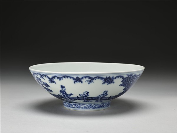 敞口,深壁,矮圈足。外壁畫仕女、庭園及雲山之景,足圈畫卷草紋一道。口足間加飾青線六道。內面純白,樸素無紋飾。底有青花書「大明宣德年製」六字二行楷款,外加雙圈。