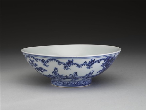 敞口,深壁,矮圈足。外壁畫仕女、庭園及雲山之景,足圈畫卷草紋一道。口足間加飾青線六道。內面純白,樸素無紋飾。底有青花書「大明宣德年製」六字二行楷款,外加雙圈。