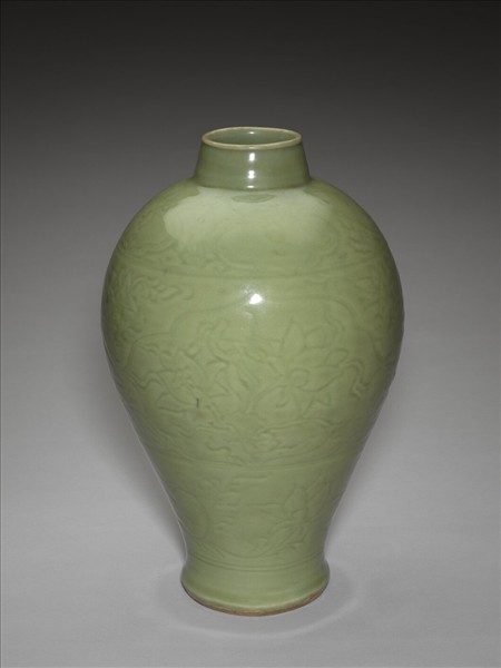 梅瓶,斂口、短頸、寬圓肩、腹下部急速束斂、脛部外撇;圈足寬淺。全器胎體厚重,施蔥青釉,釉汁瑩厚,足圈無釉,露灰白胎,胎釉間色呈火紅。外壁劃花為飾,以三道雙弦紋分為三部分:肩部四個如意首狀坎肩及珠寶紋,腹部四個菱花式開光,其內為荷花葉一叢,外為朵荷;腹下部為轉枝荷。運刀輕快,頓挫有致。此型器在元代仍沿續宋代酒瓶的功能,普遍見於各窯;但在元代禮制齊全的葬制中亦有梅瓶的出現,則其與明初以梅瓶為葬制一環的關連性值得進一步觀察。