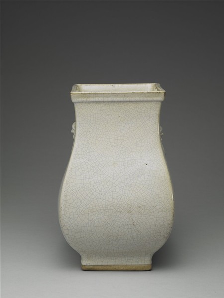 仿青銅酒器「鈁」形制,方形器,直口,口沿一道唇邊,頸部鑲貼兩銜環獸首,垂腹,方形足。厚胎,濃釉,澀底,露灰白色胎,釉色泛黃,滿布細緻灰紋開片。