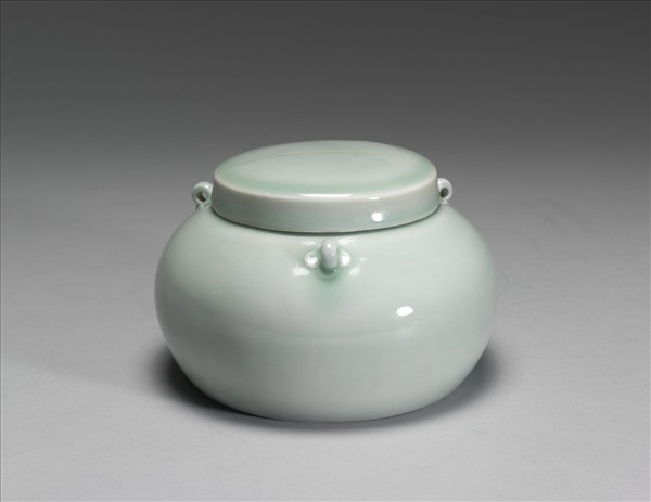 扁圓形蓋罐,直口,碩腹,矮圈足,帶平頂蓋,肩飾三繫鈕。全器施青釉,釉薄處青白,積釉處色澤翠綠,整體釉色淡柔勻亮。