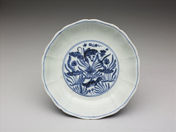 造型作十瓣牡丹花形,侈口,矮圈足。內壁純白無紋飾,盤心畫蓮塘、雙魚,外壁畫蓮花、水藻、四魚。口足內外共繪青線七道,底青花楷書「大明嘉靖年製」,外加雙圓圈。