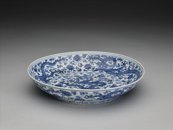 侈口,淺壁,矮圈足。盤心及內外壁畫青龍五條,飾以纏枝番蓮花紋,足圈畫如意雲一周,花紋間分飾青線八道。底有青花書「正德年製」四字二行楷款,外加雙圈。
