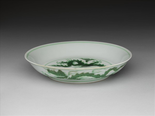 侈口,淺壁弧形,矮圈足。盤心與外壁刻畫雲龍三條,外壁隙地淺劃雙珠、波濤紋。薄胎白釉,龍紋加填綠彩,口足內外分畫綠線四道。底有青花書「大明正德年製」二行六字楷款,外加雙圈。