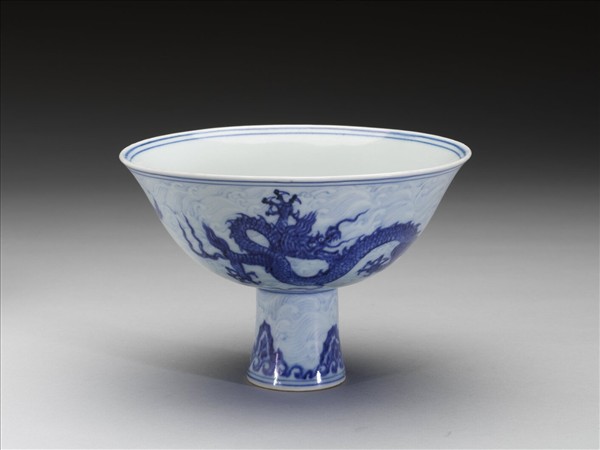 侈口,深壁,高圈足。外壁畫青花雙龍,隙地畫淺青波濤紋,足圈畫深青山石,淺青波濤紋,口足間加飾青線四道。內壁純白無紋飾,碗心有青花書「大明宣德年製」六字二行楷款,外加雙圈。