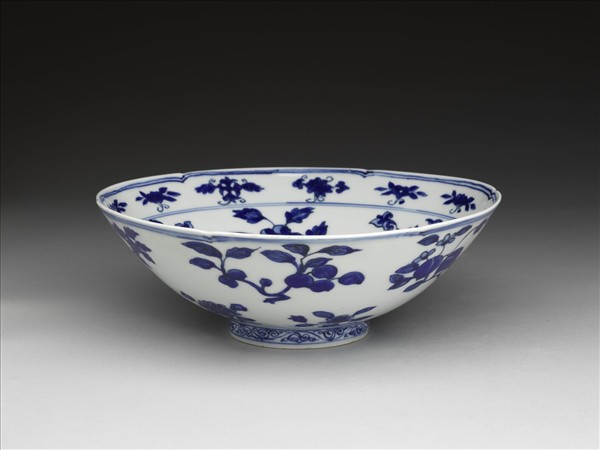 六瓣葵花形口,深壁,矮圈足。碗內口沿下兩道弦紋間畫各種花卉十二朵,內壁畫四季花卉六枝,底心三圈弦紋內畫桃實一枝。外壁口沿下弦紋兩道,器身畫折枝花、果分上下二層各六枝。足壁上下圈畫弦紋兩道,內飾卷草紋一周。底有青花書「大明萬曆年製」六字二行楷款,外加雙圈。