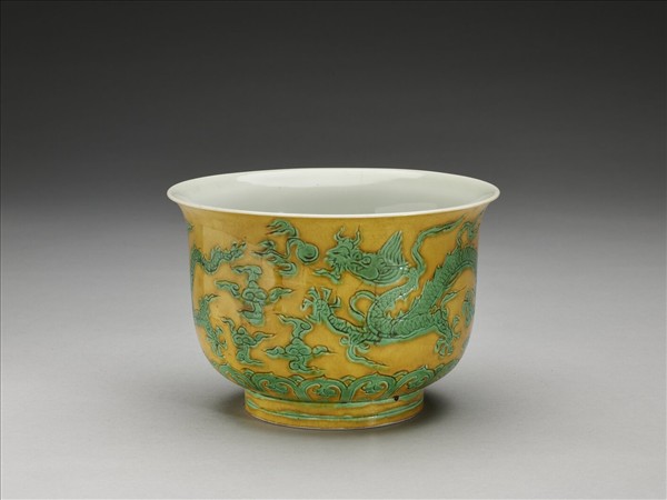 撇口,深壁,矮圈足。外壁錐拱雙龍戲珠,底邊飾雲頭紋。嬌黃釉,花紋加填綠彩,足飾綠線二道。內面純白,樸素無紋飾。底有青花書「正德年製」四字二行楷款,外加雙圈。