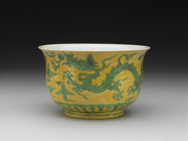 撇口,深壁,矮圈足。外壁錐拱雙龍戲珠,底邊飾雲頭紋。嬌黃釉,花紋加填綠彩,足飾綠線二道。內面純白,樸素無紋飾。底有青花書「正德年製」四字二行楷款,外加雙圈。
