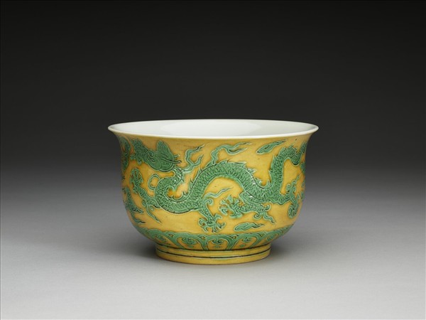 撇口,深壁,矮圈足。外壁錐拱雙龍戲珠,底邊飾雲頭紋。嬌黃釉,花紋加填綠彩,足飾綠線二道。內面純白,樸素無紋飾。底有青花書「正德年製」四字二行楷款,外加雙圈。