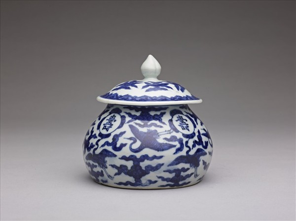 蓋面飾雲紋,邊緣間飾如意雲紋,間飾開光,內書壽字。罐身畫雲鶴八隻,兩兩相對,共四組。其中一組,或因筆誤所致,而與其他三組略顯不同。底青花楷書「大明嘉靖年製」,外加雙圓圈。