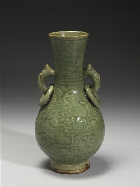 龍泉窯 青瓷刻花獸耳銜環瓶