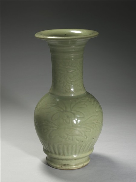 鳳尾瓶,與上件相似而略小,喇叭狀撇口、長頸、圓肩、斂腹,脛部束以一道凸箍稜,與足圈約有二指距。外壁刻劃為飾,口下四道橫弦紋,頸部劃花折枝花卉,腹部劃折枝花卉四組,劃花紋飾均僅略具輪廓,線條鬆弛;下腹部凸雕蓮瓣紋,紋為凸稜阻斷。足圈方平,底中空圓整平切,並接另片內底。足圈無釉。此器脛部束稜而不與底圈相接方式,與英國所藏宣德七年(1432)器相近。