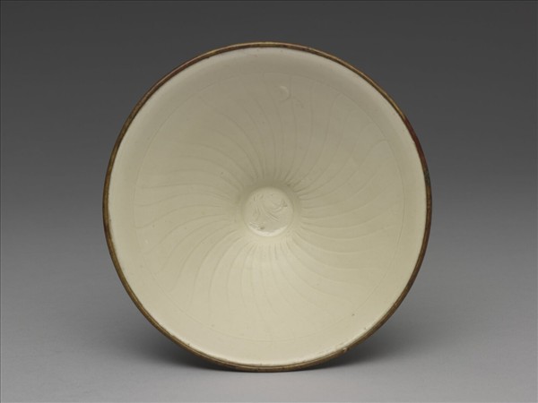 斗笠式小盞,侈口小足,壁深斜,小圓底,矮圈足,內底圓形深陷,劃有米字樣交叉線,自碗心向口沿劃出 S 狀花瓣線,線紋緊密如菊瓣,雙刀刻劃若瓣瓣具陰影厚度,有如一握花盞的脈絡。圈足滿釉,足周部分沾沙,口沿一周無釉,芒口澀胎,胎色白。此類小盞數量頗多。唐代金銀器研究者或認為此種旋繞樣紋飾受外來文化影響,由宋代定窯看來,已是經常運用且延續長久的文樣;遼劉祜墓(1099)已有之,直到南宋黃渙墓(1226)仍能見及。在同時期耀州窯紋飾中,有的旋紋加上歧出短線有如荷葉,且中央以龜為飾。則定瓷旋紋或亦此意,碗心所作交叉線條或有龜紋之意。