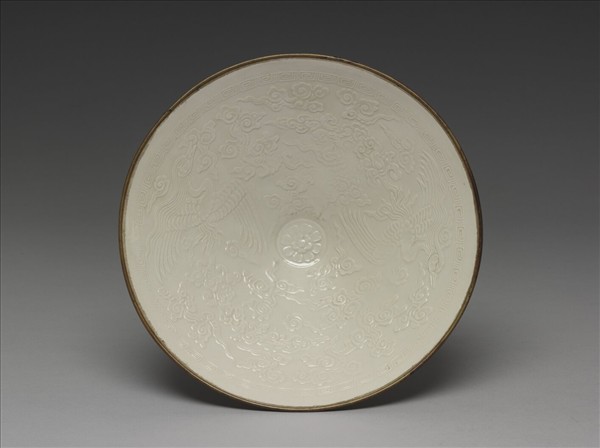 斗笠式碗,寬圓口、小圈足,器壁深斜;足滿釉,口鑲銅稜釦。器裡印花為飾,口沿下回紋一道。周壁印雙飛鳳,鳳首若鴛鴦,而長尾若雲帶拖連尾翼,身姿華麗,與《營造法式》「真人」騎跨拖著雲尾的鳳鳥形樣相似;隙地填飾雲紋。底心印朵花。