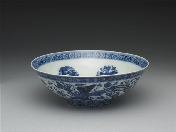 碗,侈口,圓弧腹,圈足。足底露胎。以釉下青花繪飾,外壁繪鳳凰一對,間飾纏枝番蓮花,底邊一圈蓮瓣紋;內壁飾六鳳,碗心畫一平展花朵,圍繞以如意雲頭形紋;底外青花繪鳳穿蓮,外加單圓圈。青花濃豔,有滲青斑。