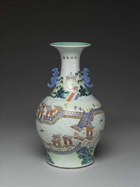 粉彩山水樓閣圖雙耳瓶