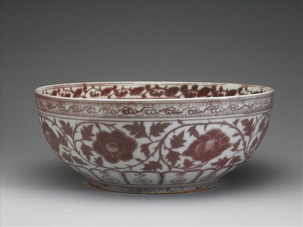 直口,深弧壁,矮圈足。內壁繪纏枝菊花八朵,上下加飾纏枝靈芝與回文各一圈,碗內底心畫呈三叉枝的折枝牡丹花紋。外壁亦畫纏枝牡丹花八朵,上下另繪波濤與蓮瓣紋各一道,足圈畫回文一周。胎骨厚重,釉裡紅呈色頗豔,器底露胎,火石紅底。碗心畫折枝花卉,內外壁為纏枝花卉紋,周邊紋飾外為波濤、蓮瓣、回文,內為纏轉枝卷草或花卉、回文,尤其特別的,是外壁圈足上的變形蓮瓣紋,內繪寶相花,而不像其他蓮瓣紋內以雲頭紋或其他為飾。