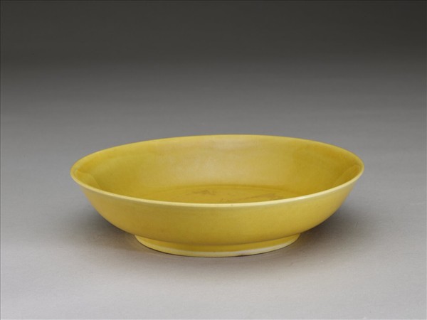 侈口窄唇,深壁,矮圈足。胎質較薄,器內外壁滿施嬌黃釉,樸素無紋飾。底有青花書「大明正德年製」六字二行楷款,外加雙圈。
