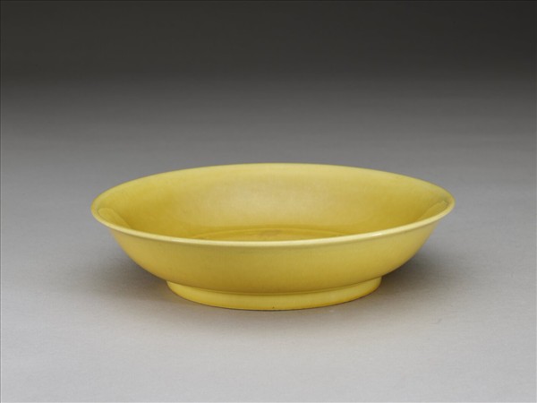 侈口窄唇,深壁,矮圈足。胎質較薄,器內外壁滿施嬌黃釉,樸素無紋飾。底有青花書「大明正德年製」六字二行楷款,外加雙圈。