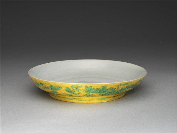 侈口,淺壁,矮圈足。胎骨較薄。內面純白釉,周壁淺劃雙龍戲珠,盤心劃朵雲,加飾雙圈。外壁嬌黃釉地,錐拱雙雲龍戲珠,加填綠彩。足圈刻劃綠線一道。底有青花書「正德年製」四字二行楷款,外加雙圈。