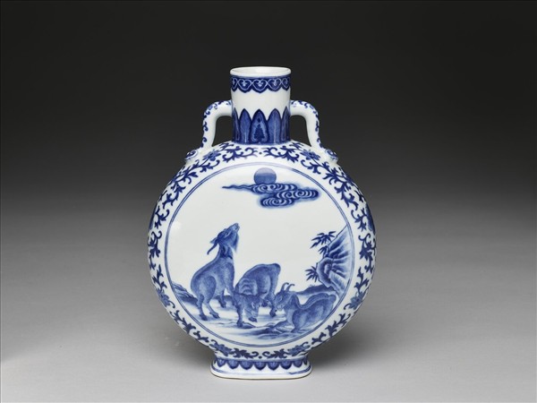 青花三羊開泰圖扁壺