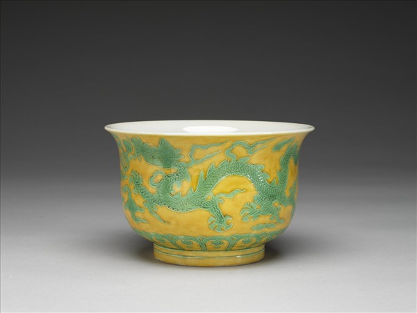 撇口,深壁,矮圈足。外壁錐拱雙龍戲珠,底邊飾雲頭紋。嬌黃釉,花紋加填綠彩,足飾綠線二道。內面純白,樸素無紋飾。底有青花書「正德年製」四字二行楷款,外加雙圈。