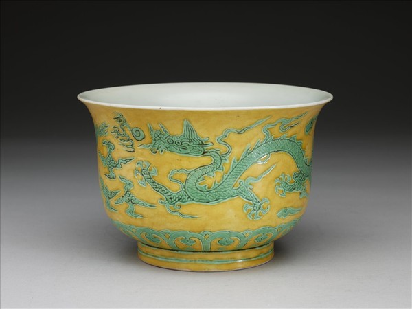 撇口,深壁,矮圈足。外壁錐拱雙龍戲珠,底邊飾雲頭紋。嬌黃釉,花紋加填綠彩,足飾綠線二道。內面純白,樸素無紋飾。底有青花書「正德年製」四字二行楷款,外加雙圈。