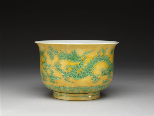 撇口,深壁,矮圈足。外壁錐拱雙龍戲珠,底邊飾雲頭紋。嬌黃釉,花紋加填綠彩,足飾綠線二道。內面純白,樸素無紋飾。底有青花書「正德年製」四字二行楷款,外加雙圈。