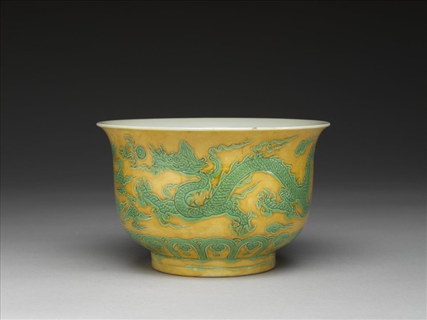 撇口,深壁,矮圈足。外壁錐拱雙龍戲珠,底邊飾雲頭紋。嬌黃釉,花紋加填綠彩,足飾綠線二道。內面純白,樸素無紋飾。底有青花書「正德年製」四字二行楷款,外加雙圈。