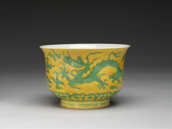 撇口,深壁,矮圈足。外壁錐拱雙龍戲珠,底邊飾雲頭紋。嬌黃釉,花紋加填綠彩,足飾綠線二道。內面純白,樸素無紋飾。底有青花書「正德年製」四字二行楷款,外加雙圈。
