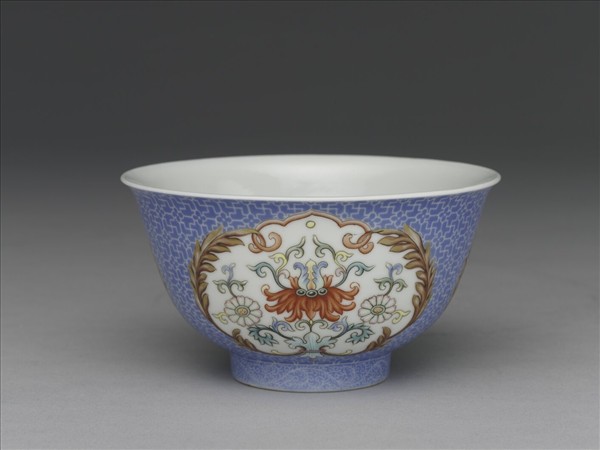 侈口碗,窄唇,深弧壁,矮圈足。薄胎白釉。器內底彩畫折枝石竹花;外壁藍彩地上畫四瓣花與卍字錦紋,腹部三面開光,以枯葉及雲頭紋為框,內中心畫變形蓮一朵,兩旁白菊各一;足圈為藍地捲草錦紋。外底心書「大清乾隆年製」三行青花篆字款。