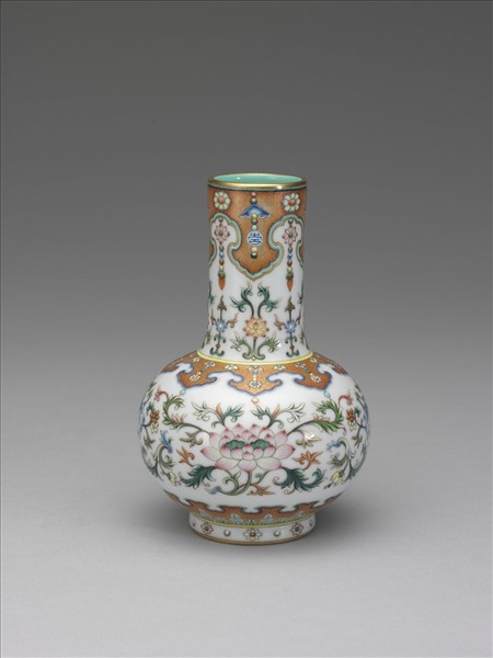 瓶,圓直口,長頸,斜肩,碩圓腹,矮圈足。胎薄輕巧,瓶內及底均施淺綠色釉,器外施白釉。口、頸,底邊各繪紅地描金如意形錦地,邊線均鉤畫藍邊,口頸的如意紋錦地上並加彩繪磬紋、團壽紋及瓔珞紋;底邊則加蕉葉紋等;頸部白地上飾番蓮朵花,腹部主紋為四組藍、白相間的同心並蒂番蓮花,圈足畫朵花一圈。口沿、足底描金。外底心留白框內書「大清乾隆年製」三行青花篆款。